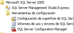 - Dirigirse a Incio >> Programas >> Microsoft SQL Server 2005 >> Herramientas de configuración >> Configuración de superficie de SQL Server.
