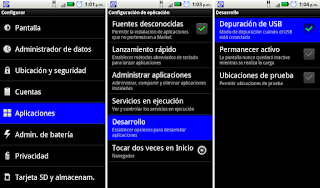 - Configuración >> Aplicaciones >> Desarrollo >> Tildar Depuración de USB.